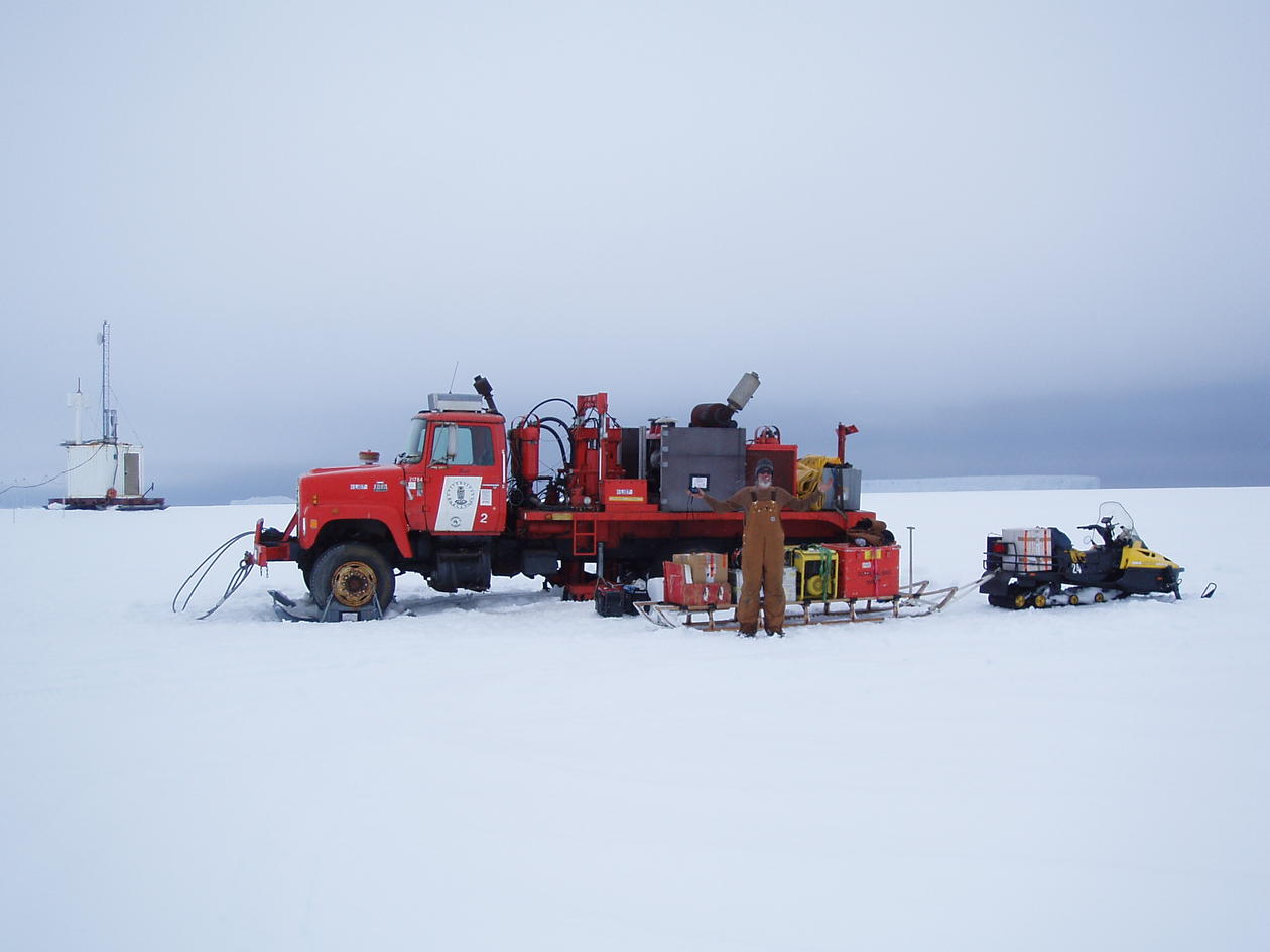 Den første testen ble gjort helt ute ved kanten av isshelfen hvor isen er ca. 140 m tykk og vanndypet ca. 250 m. Her er det et observatorium (PALAOA) med to hydrofoner i vannet for kontinuerlige opptak av dyrelyder i vannet. Institutt for geovitenskaps 16 tonn tunge vibrator på ski blir trukket av en beltebil, og er snøen løs kan det være nødvendig med to. Det viktigste er nå å få gjort en sammenligning mellom styrken på de seismiske refleksjonene fra henholdsvis vibrator og sprengstoff i borehull. Å bore et 20 meter dypt hull i en fei selv om det er i hard snø, er ikke trivielt.