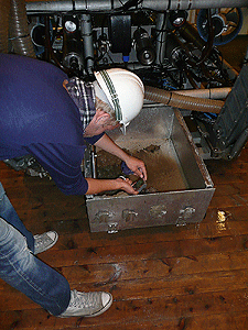 GS08-155-30 ROV PC is the code of one of the pushcores taken by the ROV. (GS stands for G.O. Sars, 08 is number of year, 155 is the cruise code, 30 ROV is ROV-dive with pushcore number 30). This code is also logged by the geologists and like that, they know exactly position and date/time for this sample. This profile of the sediments the pushcore took up was about 15 centimeters high with a water column on top. Both the microbiologists and the geochemistry took samples of the water to be used later in analyses. William got an ingenious idea on how to move the plastic cylinder down, at the same time as the sediments was standing still. In any case, with help from Anne Grethe and a pipe tong the job was done without spills or mayor disasters. And since Anne Grethe still was there, he also got help with different types of samples of the 15 cm layers of the sediments. After each cutting of the sediments, the equipment must be washed and sterilized with ethanol. There must also be taken samples to the DAPI and other stuff. This took a little over two hours and was the last thing William did this day, before he headed for the bed.