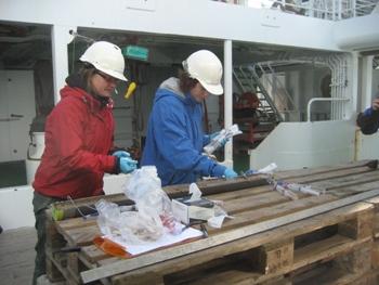 She studies the pore water on ship for what it shows about the chemical reactions in the sediment. Later back at the university lab she will analyze the samples for their elements and mineral content. The element analysis is more accurate so that is her major focus. However, the minerals are what will give the real history of the sediment layer. They will show for example evidence of hydrothermal activity.