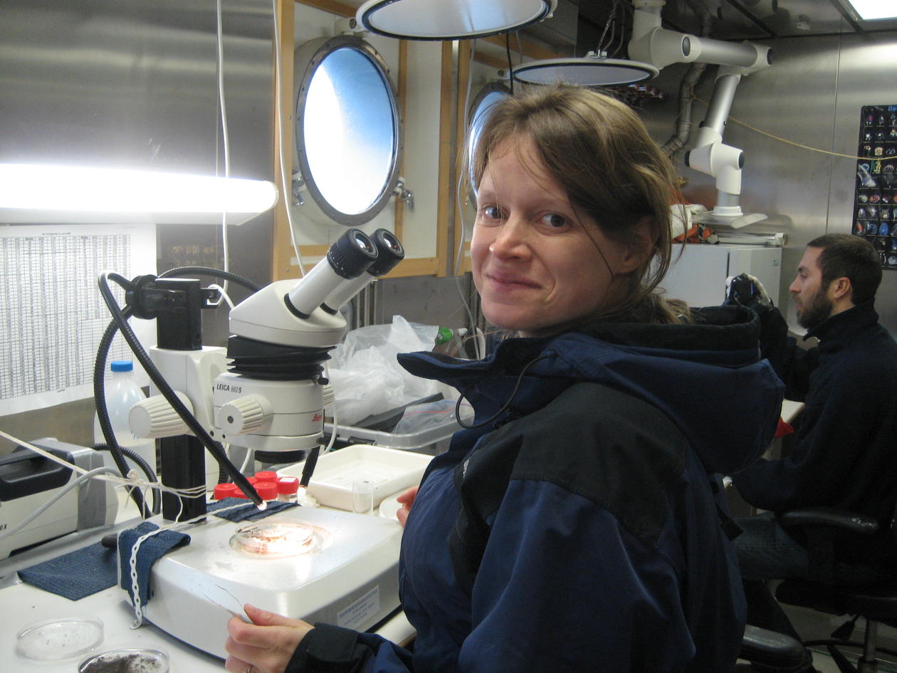 The work of the biologists once the samples are in has to be very fast as the organisms change quickly, as you can imagine, once they leave their dark, highly pressured environment and are in contact with the above surface world. They are first carefully pulled from with tweezers, or rinsed clear, of sediment.