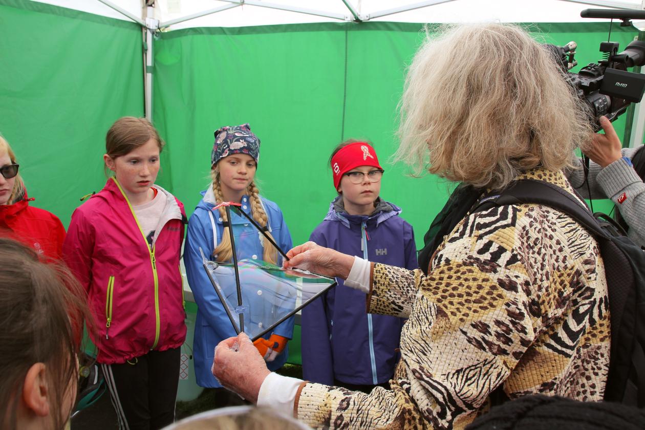Den amerikanske matematikaren har hatt travle dagar i Oslo og Bergen i samband med prisutdelinga. I Botanisk Hage fekk ho utforska Arkimedes’ labyrint og løysa vitskaplege oppgåver i hagen, saman med elevane. Det var tydeleg at Uhlenbeck sette pris på den vitskaplege utforskinga saman med vitelystne elevar.
