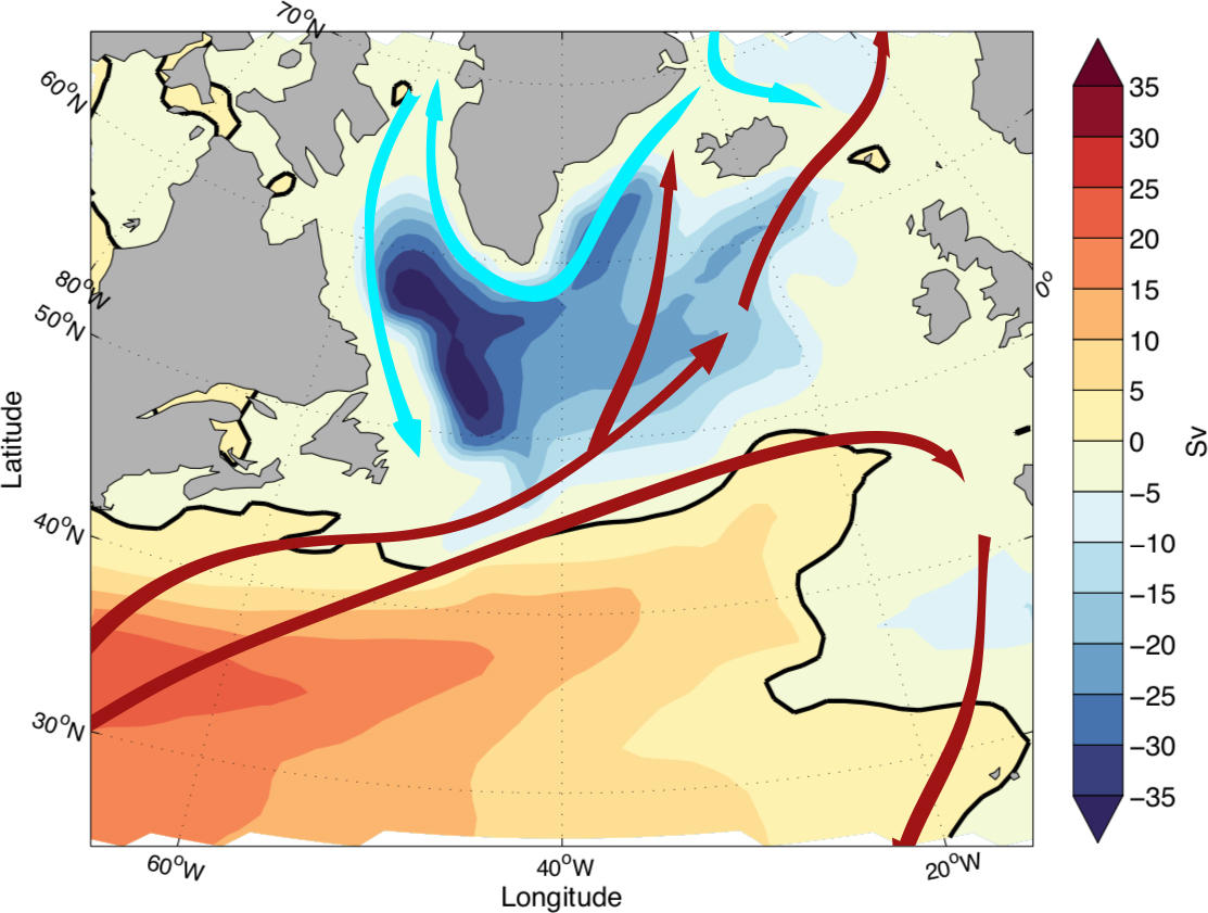 Sverdrup vist i Nord-Atlanteren, med den nordatlantiske gyren innteikna i grønt.
