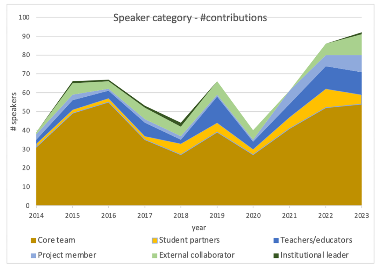 - Som del av arbeidet med å bygge en kollegial og forskningsbasert undervisningskultur, har vi jobbet systematisk med spredning. Det har vært et mål å få flere med i samtalen om undervisning og læring. Når vi ser på utviklingen fra 2014 og fram til i dag er det tydelig at flere nå deltar. Hvis vi ser på for eksempel presentasjoner i 2014 var det 14 ulike personer som snakket på ulike arrangment om undervisning og læring. I 2023 var det 80 ulike personer som presenterte. I tillegg har studentene i løpet av 10 år arrangert og bidratt til over 345 ulike aktiviteter, sier Førland.