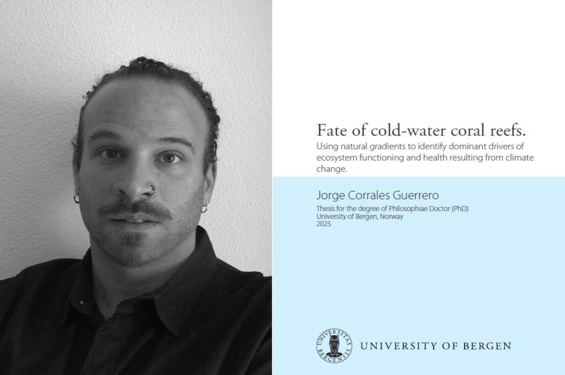 Jorge Corrales Guerrero disputerer 10.12.2025 for ph.d.-graden ved Universitetet i Bergen med avhandlingen "Fate of cold-water coral reefs".
