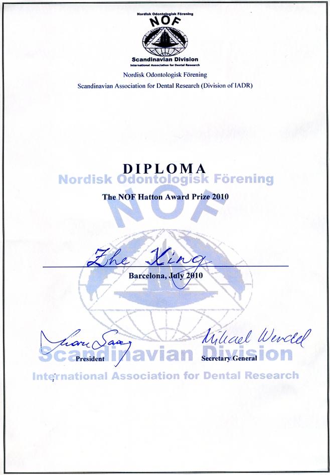 Stipendiat Zhe Xing vant The NOF Regional hatton awards competition – 2010 på IADR møtet i Barcelona 14-17 juli.