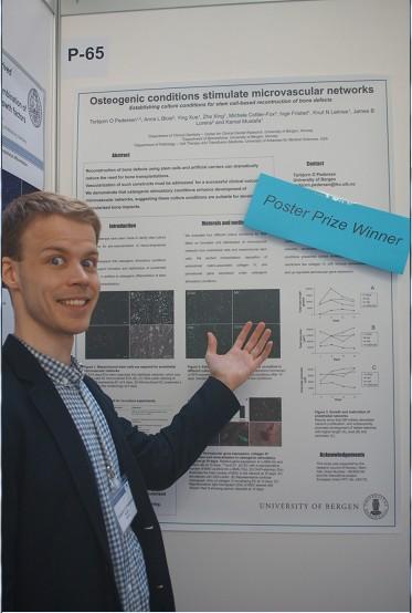 Stipendiat Torbjørn Østvik Pedersen, ved Institutt for biomedisin og institutt for klinisk odontologi, mottok poster prisen under konferansen for sin poster ”Osteogenic conditions enhance growth and maturation of endothelial cell microvascular networks”.