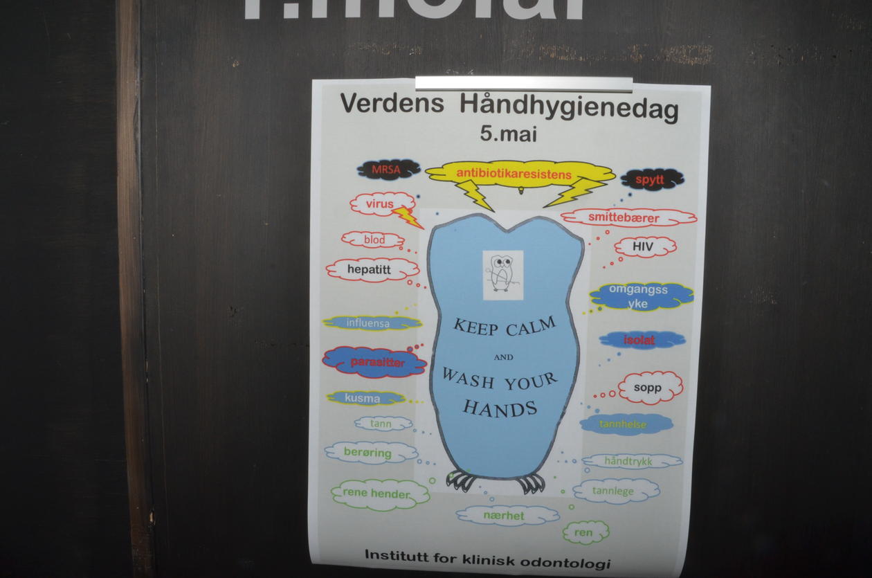Institutt for klinisk odontologi har markert Verdens håndhygienedag i dag, 4.mai, med utdeling av hånddesinfeksjonssprit og tannkost til ansatte, studenter og pasienter når de kom på jobb om morgenen, plakater og en enkel quiz om håndhygiene.