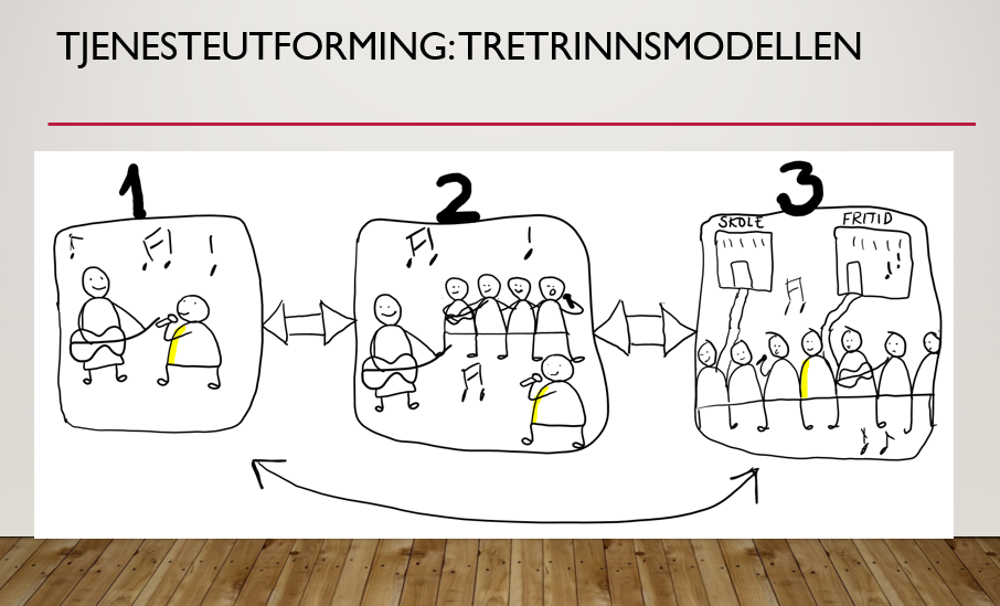 Rapporten legg elles vekt på ein tretrinnsmodell adoptert frå erfaringar med musikkterapi innan Kriminalomsorga og Psykisk helsevern. Etat for barn og familie valde då å tilpasse denne modellen til sin egen situasjon (sjå faktaboksen til høgre).