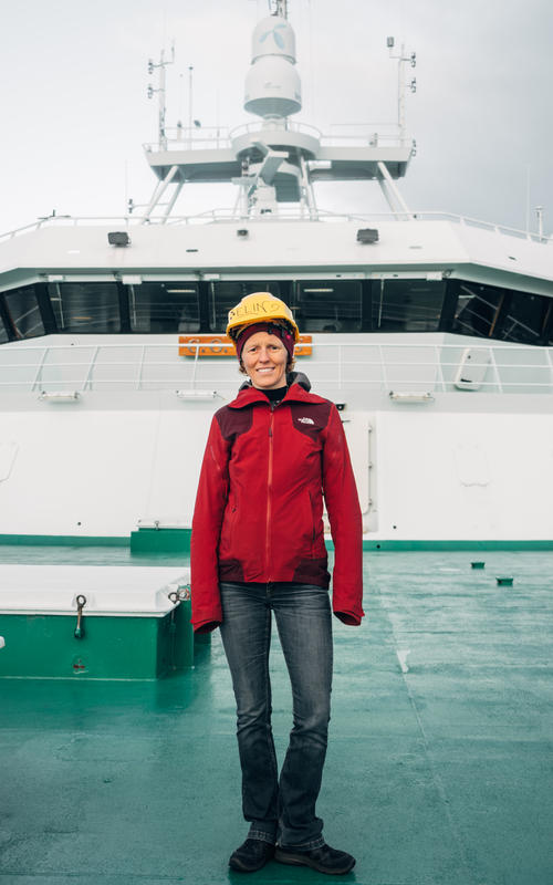 Elin tilbyr en omvisning på forskningsskipet, G.O. Sars. Skipet er eid av Havforskningsinstituttet og UiB.