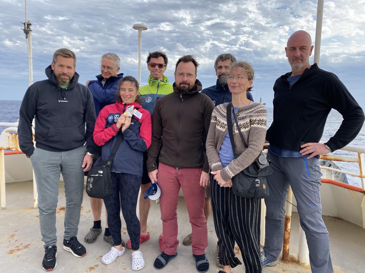 Teamet fra Kerguelen på vei sørover i Sørishavet med forskningsskipet Marion Dufresne. Fra venstre Jostein Bakke, Philip Deline, Charline Giguet-Covex Ludovic Ravannel, Eivind Støren, Fabien Arnaud, Henriette Linge og Aart Verhage.