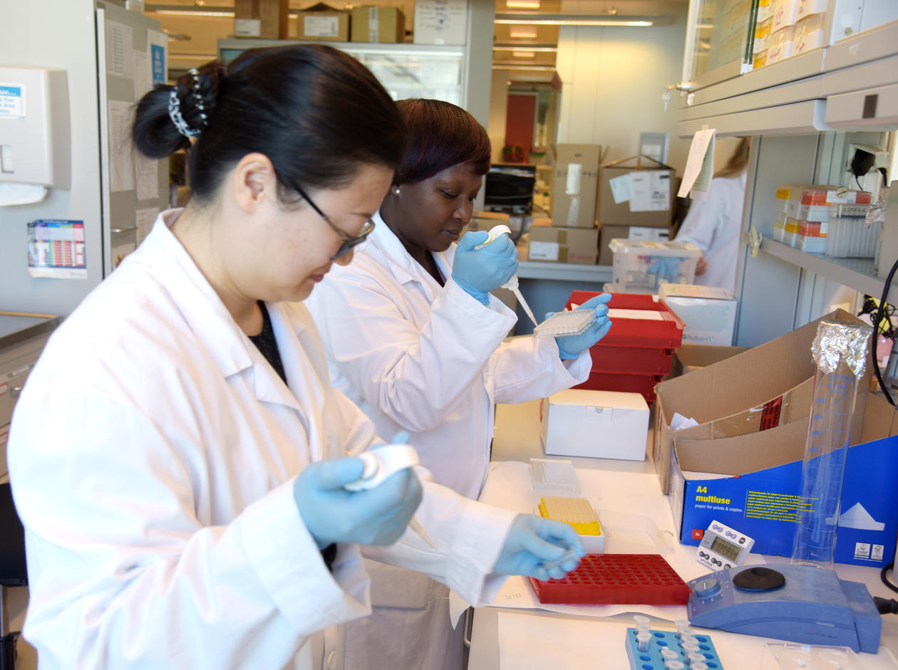 Forsker Fan Shou og PhD-kandiat Sarah Larteley Lartey Jalloh deltar i koronaforskningen.