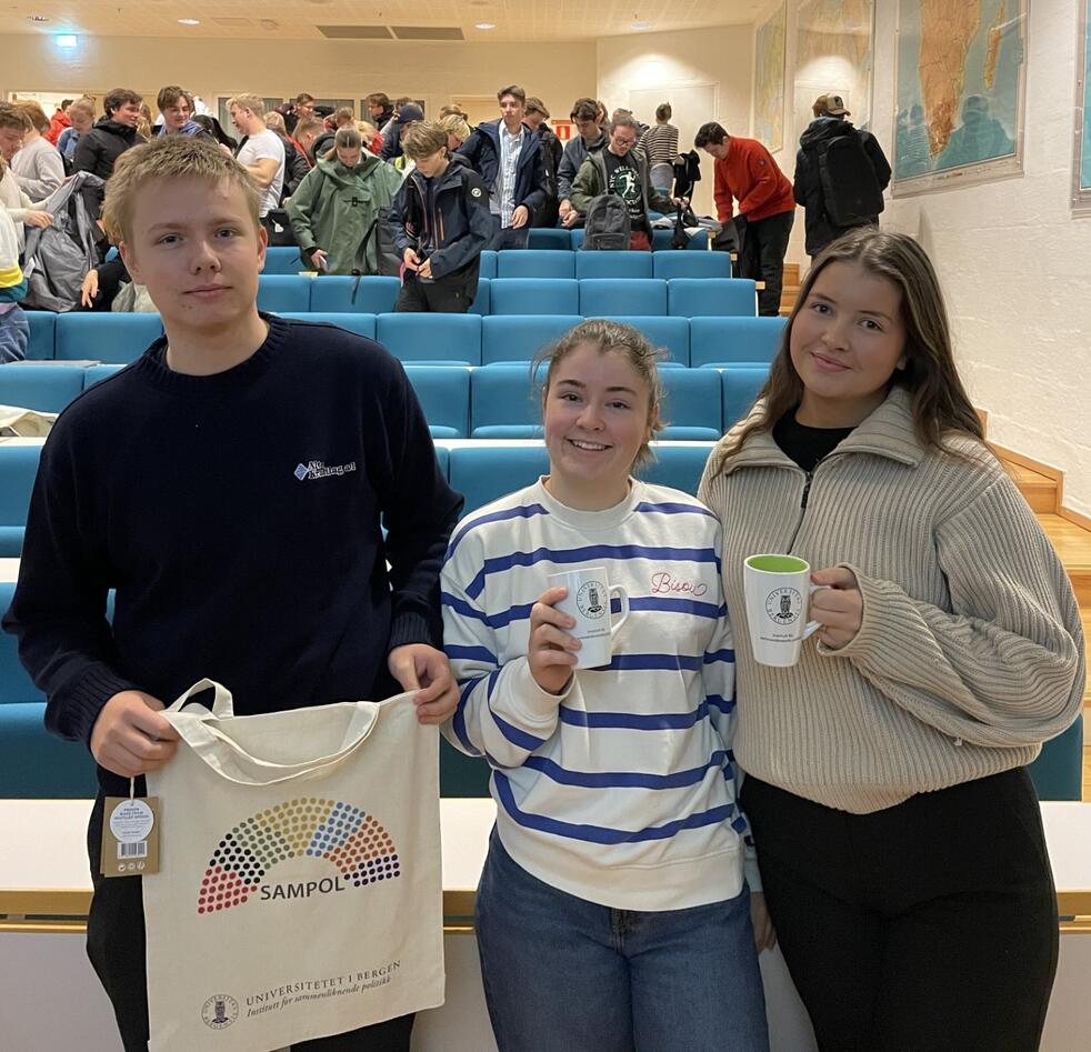 På siste forelesning organiserte Kjetil Evjen en quiz med spørsmål fra pensum i SAMPOL100 og fra emnets historie. Sampol-studentene Mats Frisk-Olsen, Elise Høyland og Martine Lekve fikk de tre ettertraktede premiene.