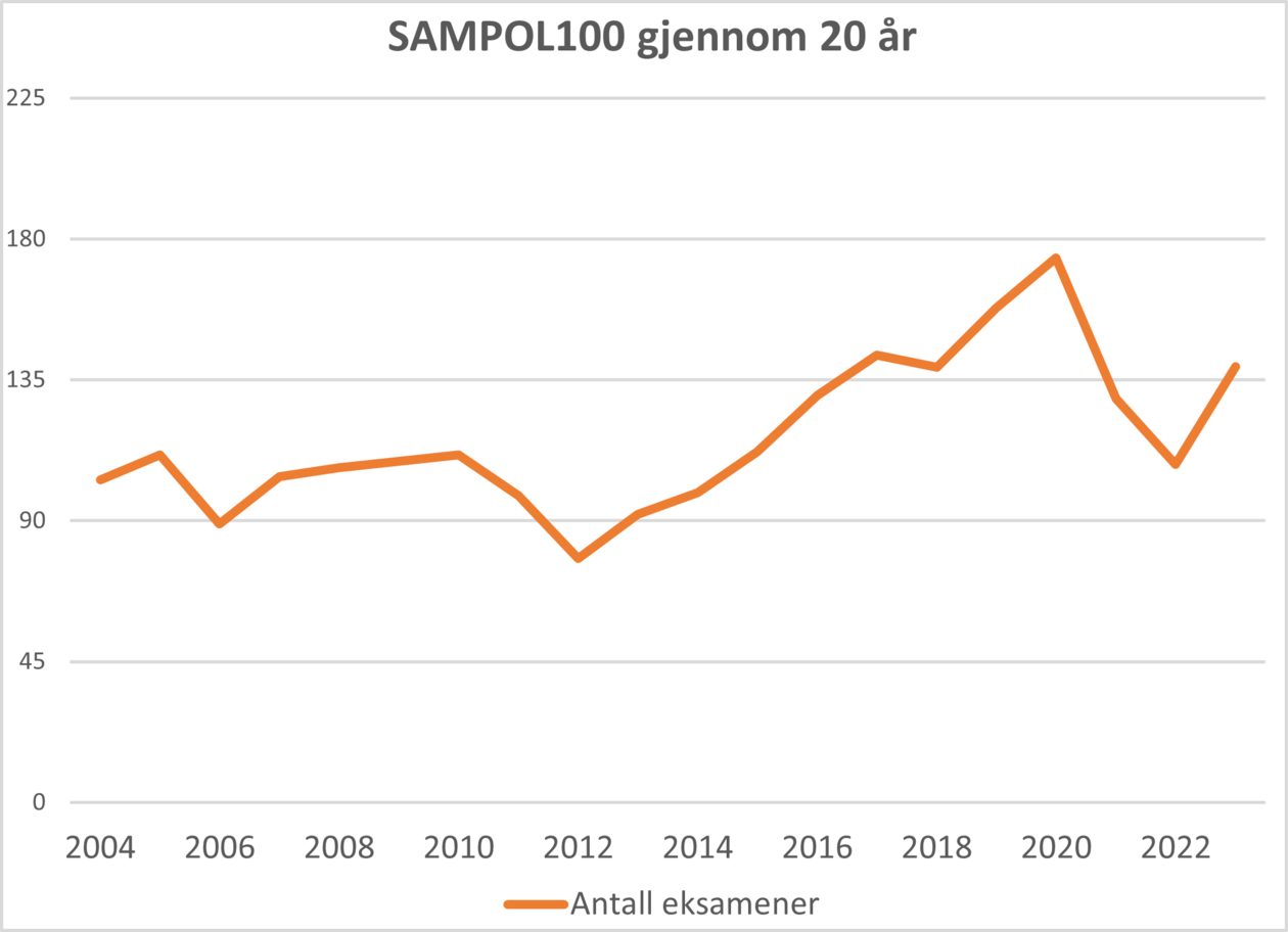 Siden oppstarten har 2194 studenter avlagt og bestått eksamen i SAMPOL100, og i år er 170 studenter oppmeldt til eksamen. I snitt har 82 studenter avlagt eksamen i SAMPOL100 hvert år siden oppstarten.