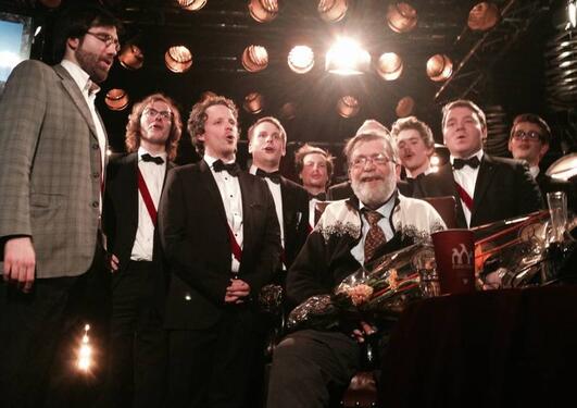 Professor Frank Aarebrot mottok mandag en påskjønnelse fra rektor ved Universtitetet i Bergen for sin formidlingsinnsats med "200 år på 200 minutter".