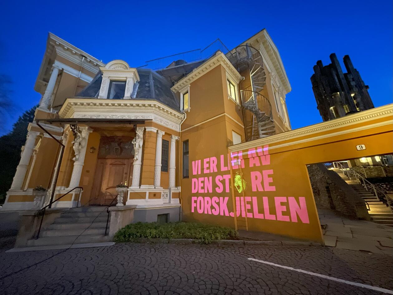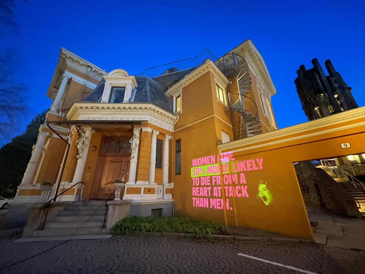 Ein torsdagskveld i mai skjedde det ei unik, midlertidig fasadeendring av Ida Bloms hus i Parkveien 9, der Senter for kvinne- og kjønnsforsking (SKOK) ved UiB held til. Då mørket fell på, fekk tilsette ved SKOK og andre forbipasserande sjå fargerike bilete, videoar og slagord manifestere seg på ytterveggen ved hovudinngangen: "Prioriter kvinnehelseforskning." "Vi er lei av den store forskjellen." "Lær kvinner hvilke symptomer de skal se etter."