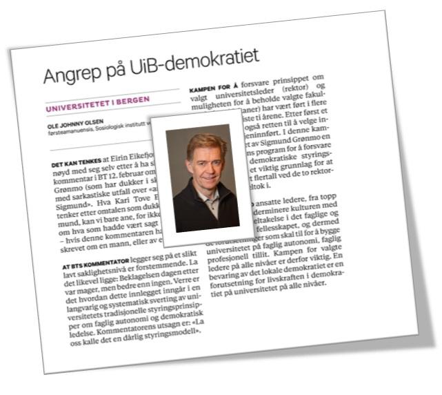 I forbindelse med Bergens Tidende sin dekning av saken om universitetsdirektørens avgang har Førstemanuensis Ole Johnny Olsen ved instituttet skrevet et debattinnlegg som kom på trykk 18. februar.