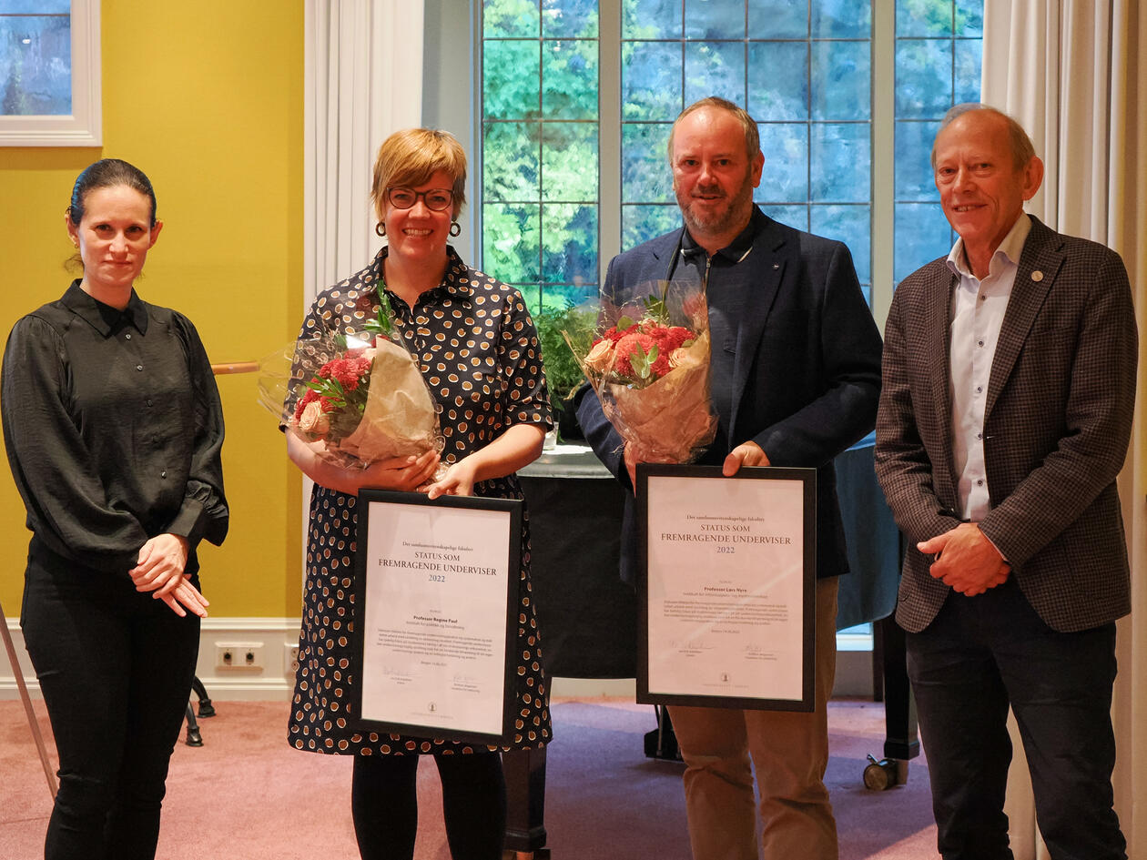 Visedekan for undervisning Kristine Jørgensen, og dekan Jan Erik Askildsen delte ut diplom og blomar til dei nyslådde meritterte undervisarane Regine Paul og Lars Nyre.