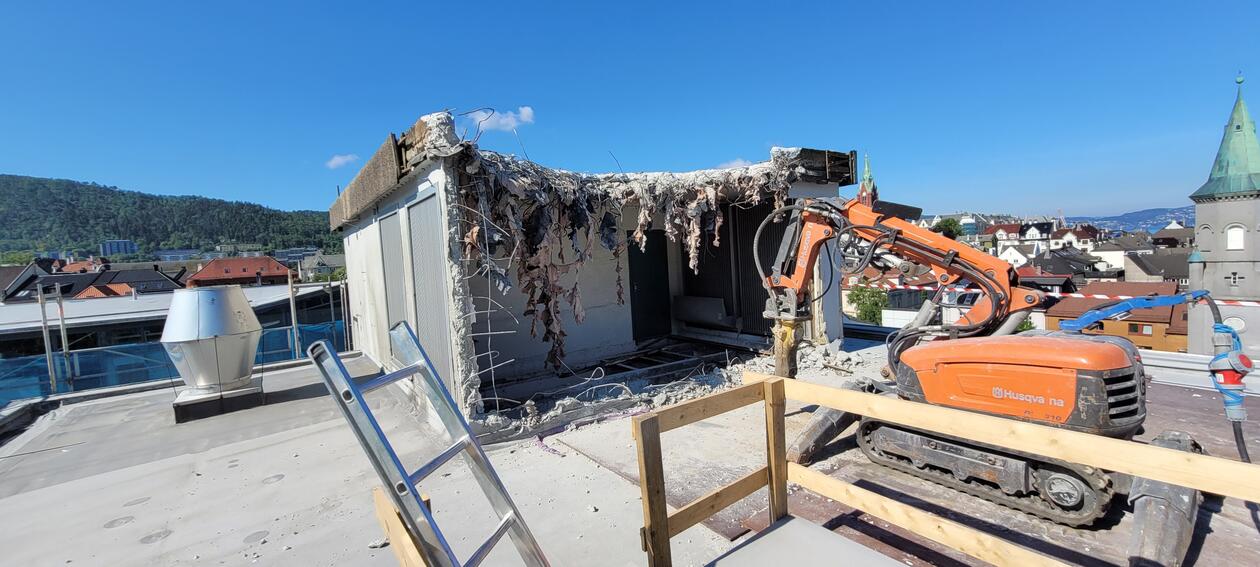 Øksehugget revet helt ned, og under ser man graving for nye fundamenter.