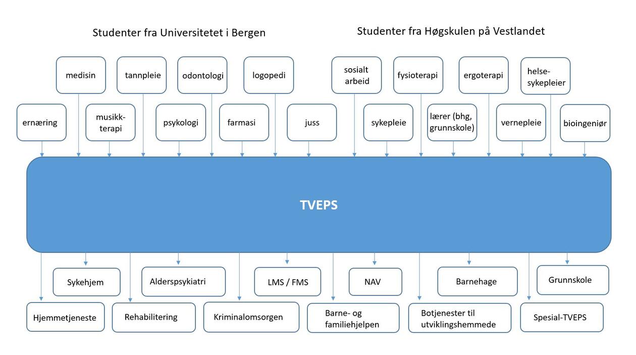 TVEPS - Senter for tverrprofesjonell samarbeidslæring trener medisin- og helsefagstudenter i tverrfaglig samarbeid. Det gjør vi ved å sende små studentgrupper, bestående av fire-fem studenter fra ulike profesjoner, ut i praksis. Praksisen foregår på våre praksisarenaer i Bergen, på Askøy og i Øygarden.