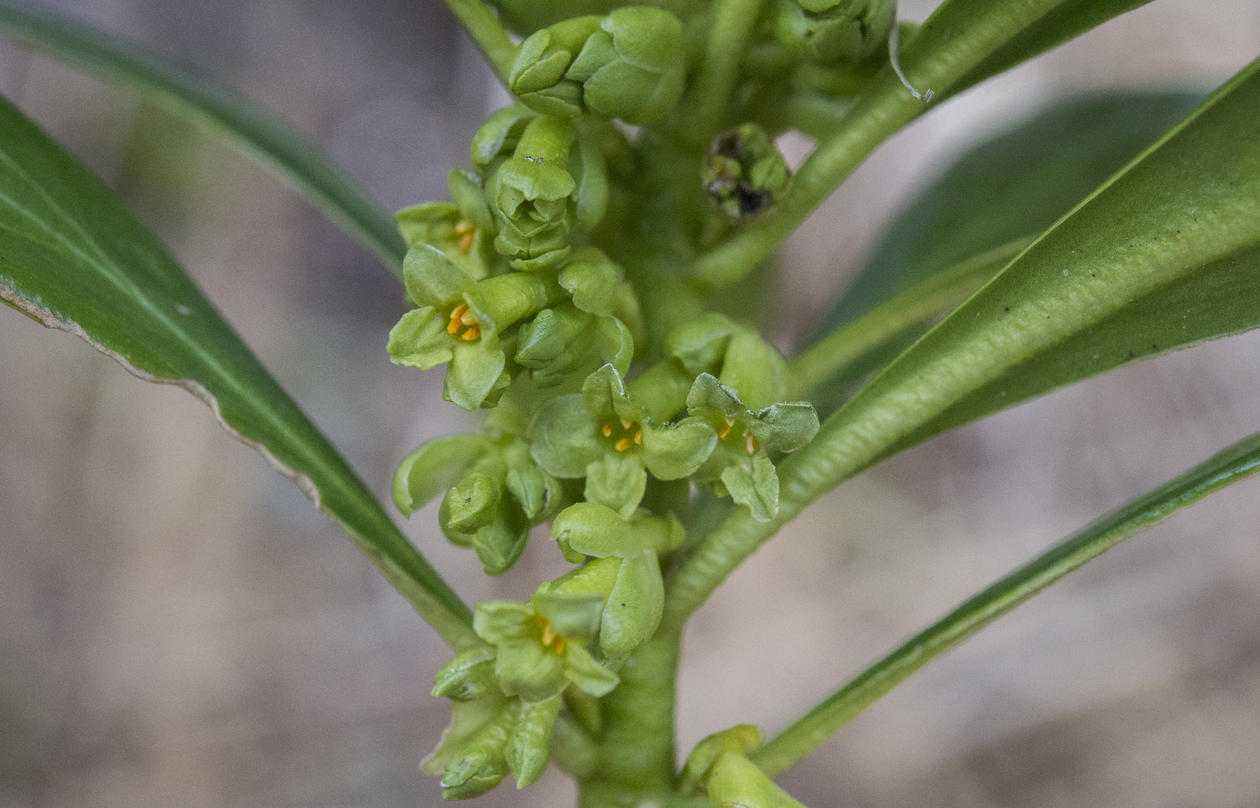 Tysbast (Daphne mezereum) blomstrer fint foran museumsbygningen. Dette er en løvfellende busk som vokser vilt i Norge på Østlandet. Planten vi har i Arboretet er kommet mye kortere, og står ennå i et tidlig knoppstadium. Men i Arboretet har vi en slektning av tysbast, nemlig laurbærtysbast (Daphne laureola) som er kommet i blomst. Planten er vintergrønn og viltvoksende i Sør-Europa, men klarer seg bra i kultur i vårt klima. Det er normalt at den blomstrer midtvinters når det er mildt.