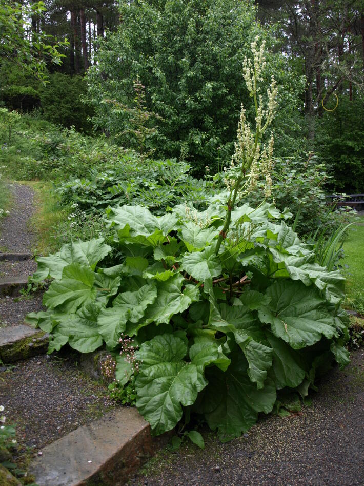 Legerabarbra (Rheum officinale) og prydrabarbra (R. palmatum)