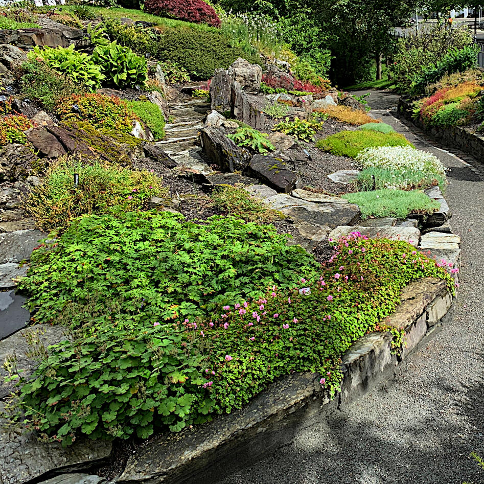 I Alpebedet fins planter fra ulike høyfjellområder i verden. Plantene i høye fjell er ofte lave og krypende dvergbusker eller stauder. Akkurat som de vokser i fjellet dyrker vi plantene på og mellom steinene og i sprekker. Her vokser dvergbusker (reinrose, vier, Rhododendron, Ruscus og Coprosma mfl.) og lave stauder (sildrer, murer, takløk og Haberlea), men også en del høyere stauder fra fjellenger. Her dyrkes også mange vårblomstrende løker og knoller på begge sider om stien. Noen planter er veldig små, så gå forsiktig, huk deg og se etter nøye!