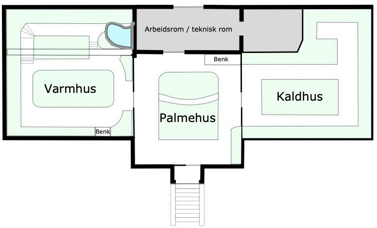 Allerede fra starten var huset delt inn i tre seksjoner med ulikt klima og de er de samme i dag: Varmhuset mot sør, palmehuset i midten og kaldhuset mot nord. Noen få planter er igjen i huset fra den opprinnelige utstillingen: den høye kentiapalmen i palmehuset og også noen stauder i varmhuset, men mange av plantene har vært her veldig lenge.