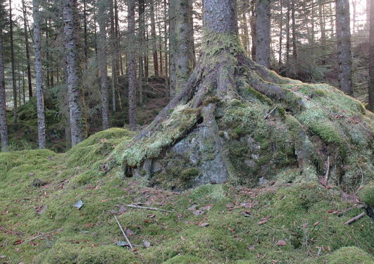 Nord i Arboretet står skogen tett helt ut mot strandbergene. Et nettverk av stier fører både gjennom lysåpen furuskog og skyggefull skog med gran og hemlokk.