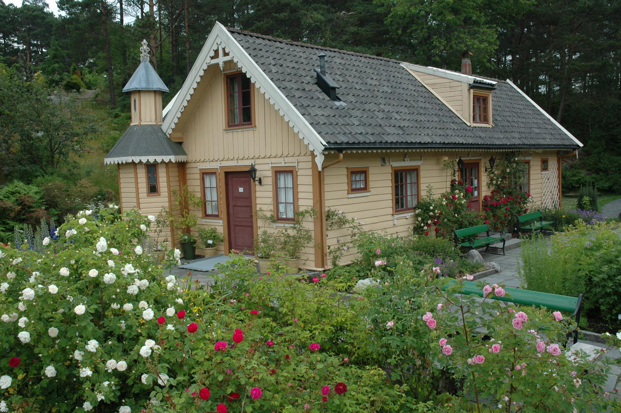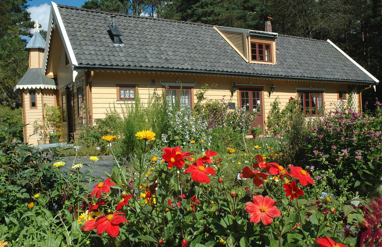 Du finner eksempelvis roser, martagonliljer, peoner, konvaller, storkenebb og hjelm. Bak huset finner du tradisjonelle frukt- og bærsorter, humle, og engplanter som blåklokke og prestekrage.