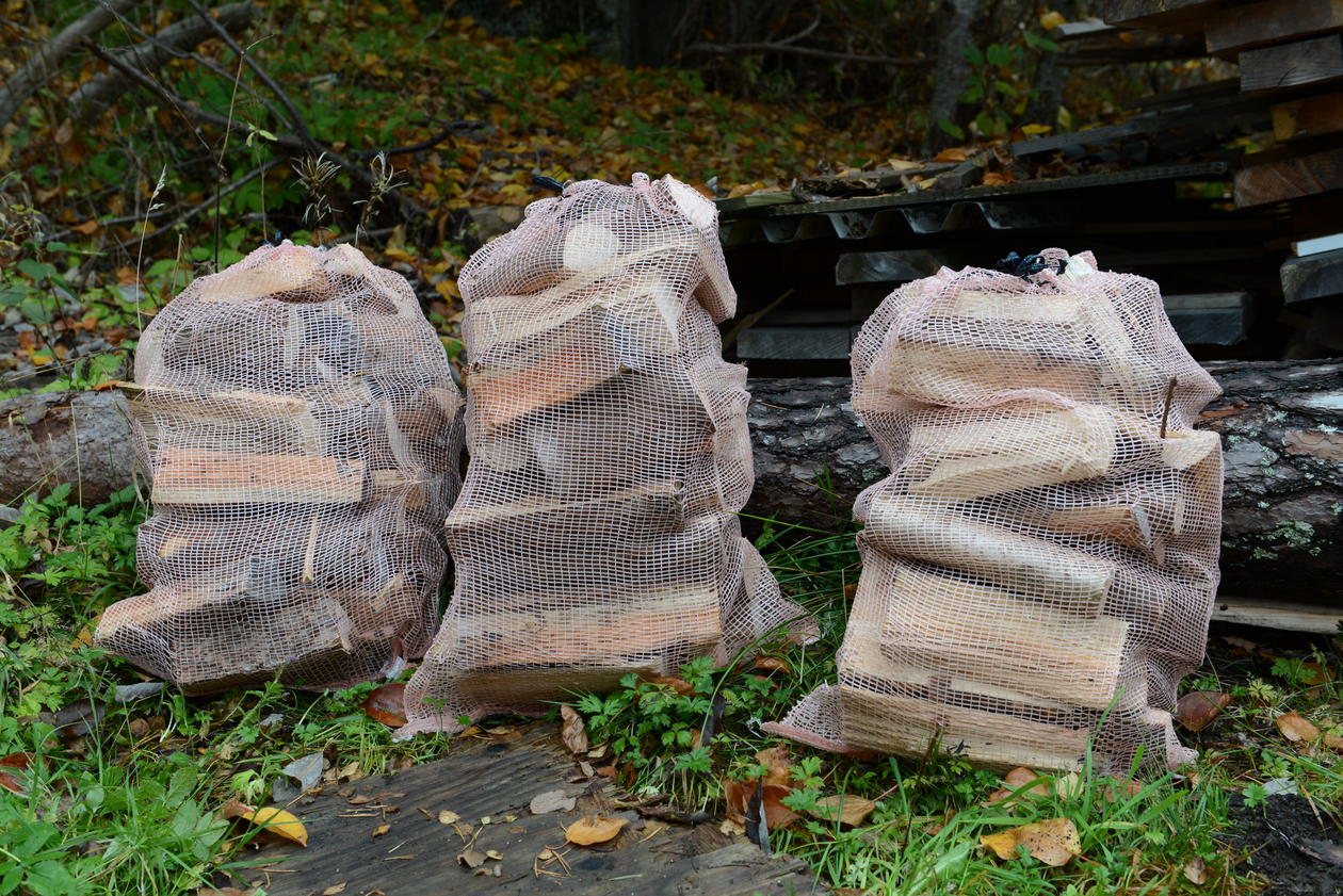 Arboretets venner v/ Olaf Hammersland og Fredrik Sørvig kapper ved og pakker den i sekker, her sammen med Gustav Flatabø.
