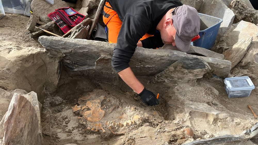 Arkeologer ved museet har gjort et sensasjonelt funn av en såkalt hellekistegrav som trolig er 4000 år gammel - altså fra 2000 år før Kristus da vi i Norge startet med jordbruk og like gammel som pyramidene i Egypt. - Det er første gang, og helt spesielt i norsk målestokk, at det er funnet en sikker hellekiste med så mange graver, sier seksjonsleder ved Universitetsmuseet Morten Ramstad.